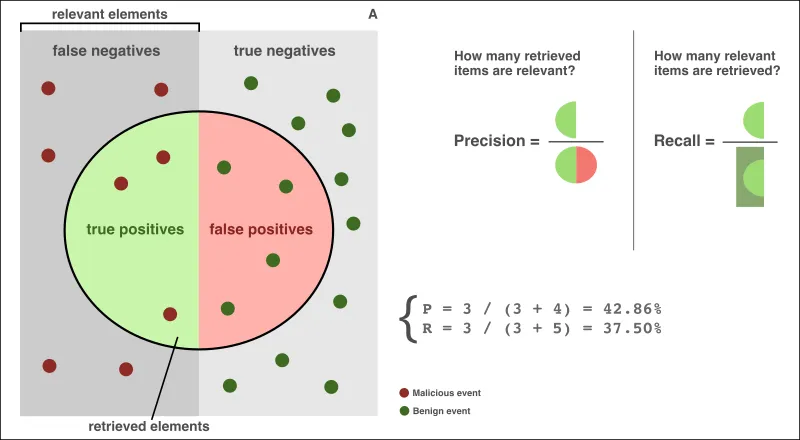 In scenario B (left), Precision is 4.25%, and Recall is 33.33% (calculated below). This scenario is stressful for CSIRT, with 95.75% Noisiness (100% - Precision %). Analytics like this not only contribute to alert fatigue but also foster skepticism among CSIRT Analysts, significantly diminishing the team’s awareness.